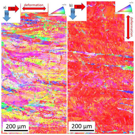 OIM maps of the longitudinal direction of the as-rolled specimens deformed in: (a) RD (550 × 1100 µm); and (b) TD directions (550 × 1100 µm).