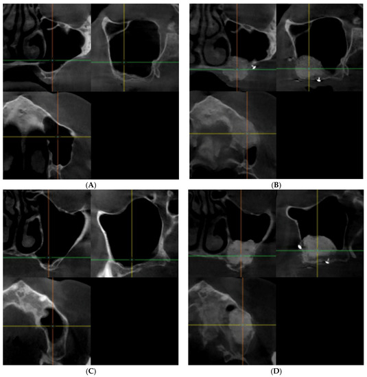 Presents pre- and postoperative cone beam computed tomography (cbCT) images of the augmented sinuses in both study groups. (A) preoperative and (B) postoperative images of one of the patients of the BoneAlbumin group, (C) preoperative and (D) postoperative images of one of the patients in the ABBM group. On each image the coronal view is presented on the upper left, the sagittal view is presented on the upper right and the axial view is presented on the lower left window.