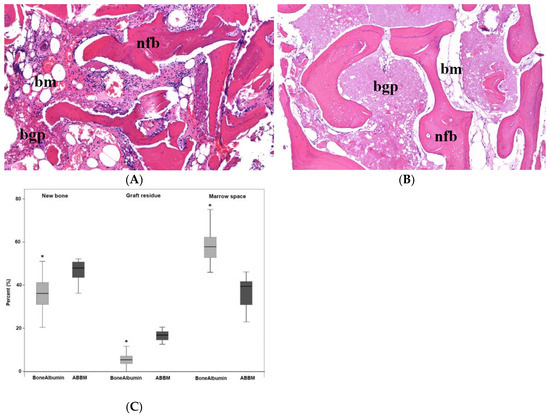 Histological assessment of the graft and the newly formed bone tissue. (A) A representative histological section with Hematoxylin-Eosin staining of a bone core biopsy sample harvested from the area augmented using BoneAlbumin. New trabecular bone formation (newly formed bone, nfb) is evident and the intertrabecular space is filled with bone marrow (bm). Only limited acellular graft residues (bone graft particles, bgp) are seen. (B) A corresponding ABBM grafted section. Trabecular new bone (nfb) is present in a similar manner; however, the marrow (bm) is partially filled with the residues of the acellular graft material (bgp). Panel (C) shows the histomorphometry data of the stained sections. Graft residues in the BoneAlbumin group are significantly less than those grafted with ABBM, at the expense of marrow space. Data are presented as median–quartiles–ranges, * represents p < 0.05 with Kruskal Wallis One-way ANOVA test between the two experimental groups, respectively.