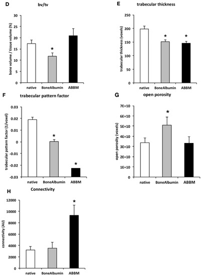 Panels (A–C) show representative µCT images of the bone core biopsy samples at the level of the residual native bone of the alveolar ridge (A), the level of the augmented bone grafted using BoneAlbumin (B) and ABBM (C). Bone volume fraction (BV/TV) is still somewhat lower the BoneAlbumin group, while in the ABBM group it is comparable to that of native bone—note that what is calculated as ‘bone’ in this metric contains the unresorbed graft ceramic (D). Trabecular thickness of the BoneAlbumin group has not yet reached the level of that of the native bone (E). Trabecular pattern factor (F) which describe bone geometry is closer to native bone in the BoneAlbumin group than in the ABBM group. Open porosity is still somewhat higher than native in the BoneAlbumin group (G), while connectivity has reached the native level (H). Please note that in these parameters the bone value is a surrogate number for the newly formed bone and the residual graft. * signals p < 0.05 versus native bone.