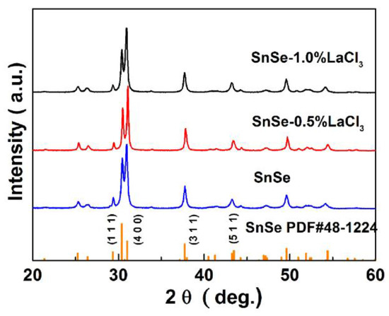 The XRD patterns of all the samples SnSe-xwt % LaCl3 (x = 0.0, 0.5 and 1.0) are shown in Figure 1. As compared with JCPDS data of PDF#48-1224, the patterns of all the compositions can be indexed by SnSe characteristic peaks with layered orthorhombic crystal structure and no second phase is observed within the detection limits of the measurement. However, a slightly stronger intensity of peak (400) with a weaker intensity of peak (100) compared to the standard diffraction peaks can be observed for all the samples, indicating the existence of anisotropy and the preferred orientations occurring along the (400) plane. To confirm the preferred orientation, the preferential factor of all the samples was calculated using the Lotgoering method [25,27], where the bc orientation degree for the (h00) crystal planes of the bulk sample is termed as F(h00). When the a-axes of crystal grains are completely aligned along the pressing direction, the calculated value of F is 1. In the present study, the calculated F(h00) values are around 0.34 for all the SnSe-xwt % LaCl3 (x = 0.0, 0.5 and 1.0) samples, which reveals that axial the plane is slightly preferentially oriented in the bc-plane. This is reasonable because SnSe crystallized with layered structure can easily exhibit preferential orientation following the uniaxial densification process, and anisotropy has been widely observed in previous studies [11,12,13,28].