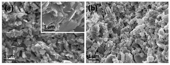 SEM morphologies of the fresh fracture surfaces for the samples SnSe-0.5 wt % LaCl3 and SnSe-1.0 wt % LaCl3 are presented in Figure 2a,b, respectively. The microstructure of the sample without LaCl3 was also given in the inset of Figure 2a. It is seen that the undoped sample, with a relative high density over 95% (the theoretical density of SnSe is 6.19 g/cm3), shows a dense morphology. The grain is plate-shaped with size of 1~2 µm in diameter and 50–100 nm in thickness. However, after doping, the grain size is reduced to 500 nm~1 µm and decreased as the doping content increased. The plate shaped grains tended to become equiaxed grain due to the reduction of the grain size. It is clear that the reduced grain size is mainly caused by the introduced foreign atoms since they would prevent the diffusion of atoms during the sintering and suppress the growth of grains. Nevertheless, such a fine-grained microstructure is desirable for TE materials, whose thermal conductivity can be reduced by their enhanced phonon scattering due to the increased grain boundaries. In addition, it is also found that the porosity increased when the doped content raised to 1%, which is consistent with the reduced density. This might be caused by some volatilization of Cl. Moreover, the distributions of the elements Sn, Se, La, and Cl on the polished surface of the representative sample SnSe-0.5 wt % LaCl3 were observed by EDS, which suggests that all the elements are distributed homogeneously.