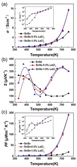 Figure 3 shows the electrical transport properties dependence with the measured temperature for all the samples SnSe-xwt % LaCl3 (x = 0.0, 0.5 and 1.0), which are measured along the direction perpendicular to the SPS pressing direction since the samples show existence of anisotropy. As shown in Figure 3a, the electrical conductivities of all the samples increase with increasing temperature in the whole measured temperature, indicating a typical semiconducting behavior with nondegenerate characteristics. It is also found that the electrical conductivity for the undoped sample is lower than the doped ones, which shows about 8.53 × 10−4 Scm−1 at room temperature which then increases nearly four orders of magnitude at 750 K, reaching 6.38 Scm−1, which is similar to the previous report [18]. After LaCl3 doping, the value has improved to about 0.02 Scm−1 at room temperature, and then sharply increased in range of 650 to 750 K. An electrical conductivity of 15.55 Scm−1 at 750 K is finally obtained, which is two times higher than that of the undoped samples at the same temperature. Additionally, similar electrical conductivities in the whole temperature range were obtained for the samples doped with 0.5% and 1.0% LaCl3. No obvious differences can be observed with increasing the doped content. The electrical conductivity can be expressed as σ = nµe, where e is the unit charge, n is the carrier concentration, and µ is the carrier mobility, respectively. Thus, the enhanced electrical conductivity after doping should be ascribed to the increased carrier concentration or the mobility or both of them. The Hall carrier concentration and Hall mobility at room temperature for the samples SnSe and SnSe-0.5 wt % LaCl3 have been measured. The results indicate that the value of the carrier concentration and carrier mobility for the undoped sample are 7.40 × 1014 cm−3 and 7.23 cm2V−1s−1, respectively. Thus, the lower carrier concentration and carrier mobility should be the reason for the lower electrical conductivity of the undoped sample, which is in agreement with the previous reports [11,12,13]. However, for the doped sample with 0.5 wt % LaCl3, the carrier concentration has increased to 1.53 × 1016 cm−3, which is nearly one order of magnitude higher than that of the undoped sample. Meanwhile, the carrier mobility also increases to 12.3 cm2 V−1 s−1 for the sample with 0.5 wt % LaCl3. This indicates that the two effects of improvement of both carrier concentration and carrier mobility lead to the enhancement in electrical conductivity, suggesting that LaCl3 is an effective dopant in optimizing the electrical transport properties of SnSe. The LaCl3 doping in SnSe matrix is a strong n-type doping. The La substituting Sn and the Cl substituting Se both increase the electron concentrations in p-type SnSe, but the electrical conductivity of the doped sample is increased. This may be due to the low carrier concentration of the undoped sample. That is, the increasing of electron concentration increased the total carrier concentration as the minority carrier. Furthermore, just a little bit of LaCl3 should be doped in the SnSe matrix, because of the decreased grain size and increased pores with the increasing LaCl3 contents observed in SEM images.