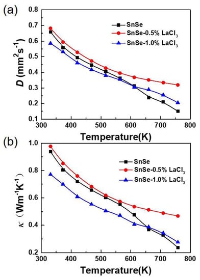 Thermal transport properties as a function of temperature for all the samples SnSe-x wt % LaCl3 (x = 0.0, 0.5, and 1.0). (a) Thermal diffusivity; (b) thermal conductivity.
