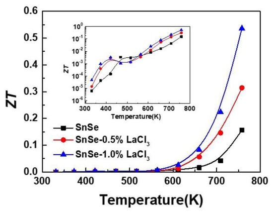 The ZT value as shown in Figure 5 was calculated by combining the electrical transport property and thermal conductivity. This shows that the ZT values for all the samples increase with increasing temperature. Because of the lower electrical transport property and higher thermal conductivity, the maximum ZT value for the undoped sample is only 0.15. For all the doped samples, the values are similar to those of the undoped ones in the temperature range of 300 to 600 K. However, attributed to the enhanced electrical conductivity and reduced lattice thermal conductivity with rising the measured temperature after doping, the ZT value is enhanced and a maximum value of 0.55 is obtained for the composition of SnSe-1.0 wt % LaCl3 at 750 K, which is nearly four times higher than the undoped one. This result suggests that rare earth elements are an effective dopant for improving the TE properties of SnSe.