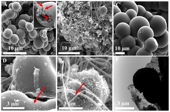 SEM images of (A) carbon microspheres formed from char material of hydrothermally treated apricot resin (HT-APG-Fe), (B) integrated structure composed of CMS and CFs of HT-APG-Fe pyrolysed with melamine at 950 °C (N-APG-Fe) (inset shows the presence of micro spheres and CFs), (C) carbon micro spheres of HT-APG-Fe pyrolysed without melamine at 950 °C (APG-Fe), (D) formation of CFs from FeMNPC from the sphere interior of N-APG-Fe (red arrow shows FeMNPC diffused out of the sphere after pyrolysis with melamine), (E) formation of CF from FeMNPC diffused out of the sphere in N-APG-Fe (red arrow shows the CF forming from the tip of FeMNPC), and (F) TEM image of FeMNPC diffused out of the sphere in N-APG-Fe.