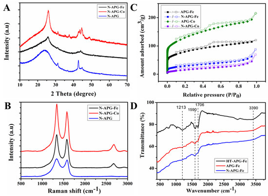 (A) XRD spectrum of N-APG, N-APG-Fe, and N-APG-Co, (B) Raman spectrum of N-APG, N-APG-Fe, and N-APG-Co, (C) N2 adsorption/desorption isotherm of APG-Fe, N-APG-Fe, N-APG-Co, and N-APG-Co, (D) FTIR spectrum of HT-APG-Fe, APG-Fe, and N-APG-Fe.