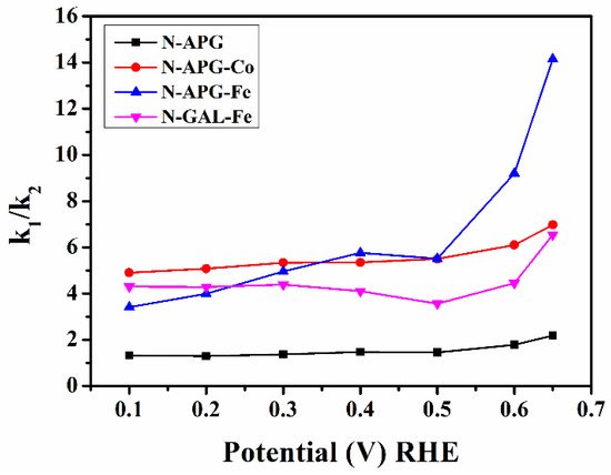 The kinetics of electron transfer using the details obtained from RRDE and the scheme suggested by Damjanovic et al. [79] are described in the SI. The rate constants were calculated based on these equations for the N-APG, N-APG-Co, N-APG-Fe, and N-GAL-Fe in the potential region of 0.10–0.65 V (Figure S11 in SI). The calculated rate constants showed that N-APG-Co, N-APG-Fe, and N-GAL-Fe were predominantly driven by a four-electron k1 kinetics, while in N-APG, the ORR was carried out via both the k1 and k2 pathways. The calculated value of the ratio of k1/k2 presented in Table S2 in the SI and Figure 5 showed k1/k2 >1 for all catalysts. The higher values of k1/k2 for N-APG-Co, N-APG-Fe, and N-GAL-Fe compared to N-APG showed a dominant four-electron k1 electron transfer pathway for these catalysts that demonstrates that the presence of the hybrid structure of N-CF and N-CMS significantly contributes to the generation of the active sites for oxygen adsorption.