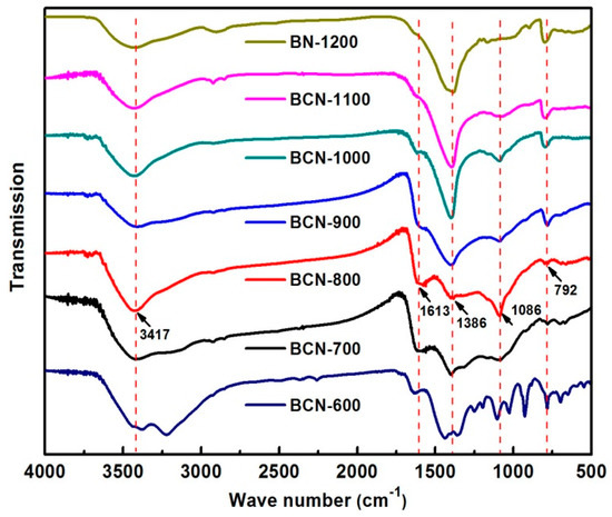 Fourier transform infrared (FTIR) spectra of boron carbonitride (BCN)-600, BCN-700, BCN-800, BCN-900, BCN-1000, BCN-1100, and BN-1200.