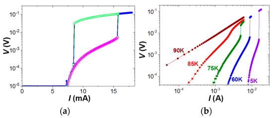 - Kunchur, M.N. Unstable Flux Flow due to Heated Electrons in Superconducting Films. Phys. Rev. Lett. 2002, 89, 137005. [Google Scholar] [CrossRef] [PubMed]