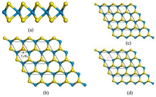 Schematic structure of pure 5 × 5 × 1 monolayer WS2: (a) side view; (b) top view; and supercell models of the defective monolayer WS2: (c) VS and (d) V2S. TS represents the S atom on the top site, and Bs represents the S atom on the bottom site. The red solid circle represents the doping position of O atom in 2 × 2 × 1, 3 × 3 × 1, 4 × 4 × 1 and 5 × 5 × 1 WS2 supercell in (b). The red dotted circles given in (c,d) represent the positions of the vacancy of 2 × 2 × 1, 3 × 3 × 1, 4 × 4 × 1 and 5 × 5 × 1 WS2 supercell. The yellow and blue balls represent S and W atoms, respectively. In (b–d), the black solid lines represent the computational model of 2 × 2 × 1, 3 × 3 × 1, and 4 × 4 × 1 WS2 supercell.