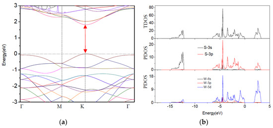 (a) Band structure of pure monolayer WS2 and (b) TDOS and PDOS of pure monolayer WS2. The band gap are shown with red arrows.