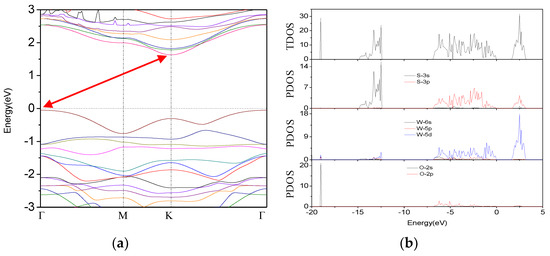 (a) Band structure of O-doped monolayer WS2 and (b) TDOS and PDOS of O-doped monolayer WS2. The band gap are shown with red arrows.