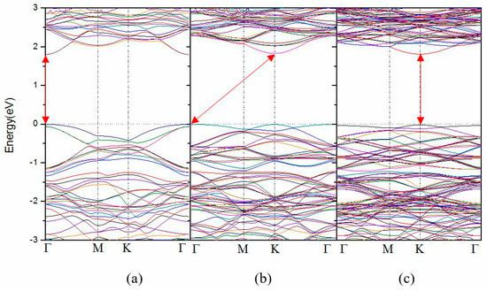 Band structure of different sizes of monolayer WS2 supercell with one substitutional O atom: (a) 3 × 3 × 1; (b) 4 × 4 × 1; and (c) 5 × 5 × 1. The band gaps are shown with red arrows.