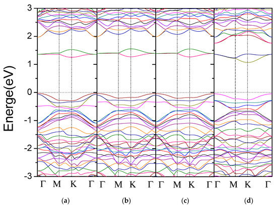Band structure of a 3 × 3 × 1 WS2 monolayer with (a) VS; (b) VS-O; (c) V2S and (d) V2S-O. The VX-O (X = S, 2S) means 1-O atom doped WS2 monolayer with VX types of vacancy defects.