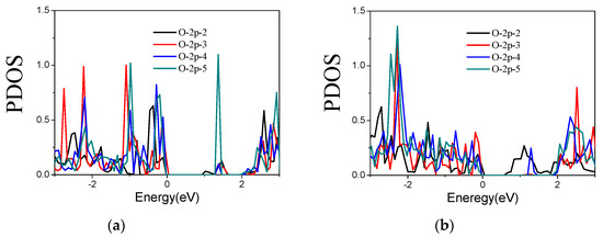 In order to further probe the effect of O atom on sulfur vacancy-defect WS2 monolayers, we calculate the PDOS of 1-O doped two defective WS2 monolayers with supercell sizes from 2 × 2 × 1 to 5 × 5 × 1. The contribution in the gap formation given by s-states of O atom is far away from the Femi energy level, but that given by p-states is near the Femi energy level, which are similar to those shown in Figure 3b. Herein, only the PDOS of p-states of O atom are given in Figure 6. Compared with the band gaps given in Table 3, it is obvious that the main contribution in band gap formation is given by p-states of O atoms. It is also found that for these two defective cases, the first non-zero positive value of PDOS in the conduction band presents at a higher energy as the supercell size increases; as a consequence, there is a slight contribution of O atom to the bottom of the conduction band, which just describes the reason of the changes of the band gap in Table 3.