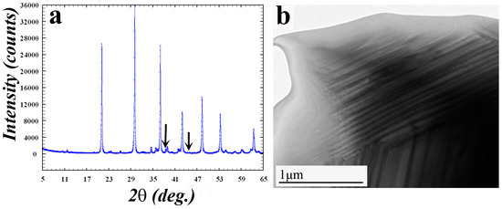 (a) X-ray powder diffraction pattern taken from the studied alloy. All peaks can be indexed in terms of ordered U(Al, Si)3 phase. Two peaks (marked by arrows) belong to pure Al. According to the low intensity of these peaks it can be understood that pure Al exists in low quantity in the alloy. (b) Typical bright field TEM image of a grain of the ordered U(Al, Si)3 phase. Domains, constituting this grain, are clearly seen.