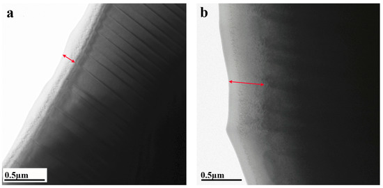 Bright field TEM images taken from the samples irradiated at doses (a) 1013 and (b) 1015 ions/cm2. The layer of disordered cubic U(Al, Si)3 phase (which appeared due to the irradiation) is marked by an arrow. It can be clearly seen that the layer becomes thicker when the dose is higher.