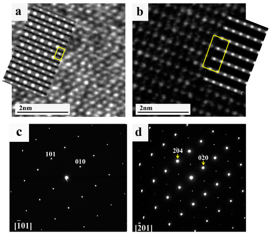 HRTEM images taken from the (a) disordered cubic and (b) ordered tetragonal U(Al, Si)3 phases at [] and [] orientations, respectively. Simulated images (shown in the insets) were prepared in JEMS [17] on the basis of the model presented in [9,10]. For clarity, the 2D unit cell is shown. (c,d) present corresponding electron diffraction patterns taken from these phases (i.e., disordered and ordered, respectively) at the same orientations.