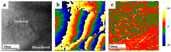 Furthermore, in the disordered phase no reminiscence of the domains, which constituted the original ordered phase, was observed. Applying GPA on the HRTEM image taken at the ordered/disordered interface (Figure 6a)—strain was evaluated. The geometrical phase map shown in Figure 6b illustrates in a more clear way than the original HRTEM image the position of the boundaries of phases. Strain map (Figure 6c) observed at this area is completely different from the one shown in Figure 2c where only ordered phase was studied. As known, a creation of radiation defects removes mechanical stresses in materials [21], in particular, in the boundary regions of block structures. It should be pointed out that the values and the signs of the strains on the presented maps are relative, because GPA algorithm demands from user the definition of the reference position in the image where the strain is zero. Significant difference between Figure 2 and Figure 6 illustrates dramatic changes of strain as a function of irradiation dose.