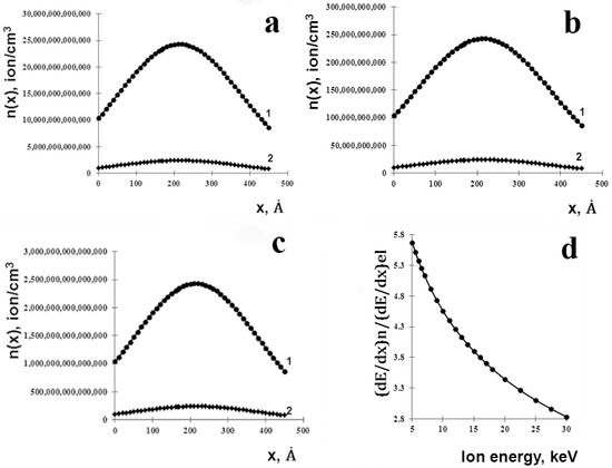 Since elastic collisions dominate near the stopping point of bombarding ions, it can be assumed that formation of structural defects in the vicinity of the given coordinate x is produced by ions with concentration n(x) (Figure 7a–c). This value can be numerically equated to the ion irradiation dose (F1), which induced structural damage at the point x, because, in fact, the number of ions which have passed over the irradiation time through an area of 1 cm2 is not less than the number of ions per 1 cm3 that were accumulated at the point x during the exposure time.
