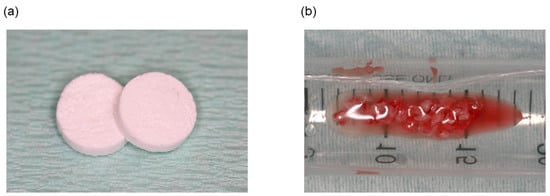 (a) Image of OCP/Col discs. The discs were 9 mm in diameter and 1.5 mm thick. (b) Autologous bone from each tooth extraction socket.