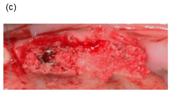 (a) Preparation of bone defects. After tooth extraction, the sockets were extended. The depth of the extended socket was at least 5 mm and the mesiodistal width was at least 10 mm. (b) Placement of titanium dental implants in each socket. (c) Defects were filled with bone substitute material. Left and right sides show autologous bone and OCP/Col implantation, respectively.