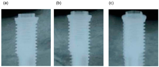 Given that OCP and OCP/Col have low radiopacity under standard X-ray conditions, the radiographic signal in the space between the host bone and titanium dental implant was negligible for OCP/Col immediately after operation. In contrast, autologous bone exhibited radiopacity. The untreated region showed the original defect around the implant. At three months after the operation, OCP/Col and autologous bone had converted to hard tissue with the same radiopacity as the surrounding bone (Figure 3a,b), whereas the untreated defect was unaltered (Figure 3c).