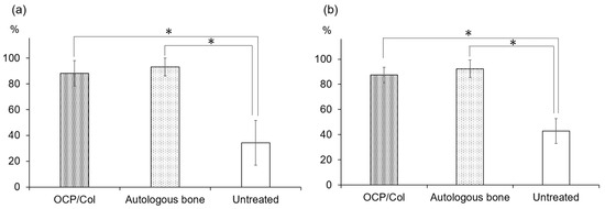 The BA% of OCP/Col, autologous bone, and the untreated defect was 88.28% ± 9.98%, 93.27% ± 6.90%, and 34.32% ± 17.25%, respectively (Figure 6a). Although, the values for OCP/Col and autologous bone differed with respect to the untreated control, there was no difference among them. The BIC% of OCP/Col, autologous bone, and the untreated defect was 87.35% ± 6.28%, 92.30% ± 6.98%, and 42.95% ± 9.93%, respectively (Figure 6b). Each of the two bone substitutes showed a significant difference with respect to the control. There was no difference in BIC% between OCP/Col and autologous bone.