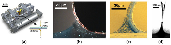 Close integration of micro-electronic devices with biological tissue would facilitate a realm of ground-breaking (in-body) applications: from surgical and diagnostic implements that naturally integrate with the human body, such as eye-implanted retina-shaped photo-sensor arrays, electrode array probes for deep brain, heart, or nerve stimulation, chips and sensors on the tip of minimally invasive instruments, and cardiac diagnostics, to numerous ex-vivo applications, such as sensory skin for robotics and prostheses and wearable health monitoring e.g., [1,2,3,4,5,6,7,8,9]. The main challenge of such devices is to match their shape and mechanical properties such as flexibility, stretchability and texture as closely as possible to that of the tissue. However, biological systems are soft, deformable, and curved, whereas conventional electronic devices are stiff, brittle, and flat. In Harris et al. [10], besides discussing the different classes of flexible electronic devices, the importance of understanding the mechanics and critical failure mechanisms to ensure proper reliability and lifetime of any flexible device is emphasized. Yu et al. [11] present a review that focuses on suitable materials, processing techniques and device applications, and conclude that “stretchable electronics bring electronics closer to humans”. Klein et al. [12] propose qualification test methods specifically designed for stretchable electronics, which result in several failure modes that closely resemble the actual device.