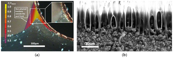 In this section, these main findings will be assessed by means of the alternative 180 peel test, introduced in Section 4.3. This test results in two side-views of separate process zones: the small fibrillating front exposed by the copper tearing and the actual side of the sample where ‘regular’ PDMS lift-off can be observed without any direct evidence of fibrils. While the small peel front results in a detailed view on the fibrillation deep in the process zone, as shown in Figure 4, its smaller size is caused by the additional constraint of the nearby copper, which complicates comparison with simulations. However, the regular 180 peel front on the actual side of the sample can still be exploited to characterise the macroscopic adhesion properties. Figure 7a depicts the bulk PDMS shape, the geometry of the peel and fibril front and copper curvature.