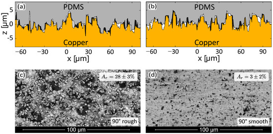 A probable dissipative mechanism during peeling that could enhance the macroscopic WOS, is non-elastic (i.e., dissipative) material behaviour around the delamination front. Previous studies showed that the dissipation from the elasto-plastic deformation in the copper foil is either negligible due to the small relative volume of the foil compared to the relatively large PDMS thickness [26], or it is significant but remains constant for other cases and does not contribute to the observed changes in WOS values [27]. To identify the occurrence of irreversible deformation during delamination in the PDMS material, the surface topologies of the separated fracture surfaces are compared. The 3D surface topology is measured with an optical profilometer (Sensofar Pl 2300, Barcelona, Spain). The initial location of the PDMS surface with respect to the copper surface is recovered by applying a customized Global Digital Image Correlation (GDIC) routine, which is able to exploit the surface texture as a pattern (instead of applying a dedicated pattern) and match images of two distinct, separated surfaces (instead of two images of the same surface). For more details, the interested reader is referred to [28]. Due to the moulding process, the copper surface is initially fully covered by PDMS, as verified from a cross-sectional analysis [25]. Hence, the difference between the surface topologies indicates the level of irreversible deformation, under the fair assumption that algorithmic matching errors and contaminations are negligible. Examples of reconstructed cross-sections are depicted in Figure 3a,b. The mean amplitude of this difference is approximately 1 m, which indicates that the average irreversible crack opening is smaller than 1 m. For this reason, the dissipated energy is insignificant compared to the critical interface opening in the macroscopic CZ model (which is 74 m for the smooth samples, and 148 m for the rough samples). This confirms that the PDMS material primarily deforms in a hyper-elastic manner.
