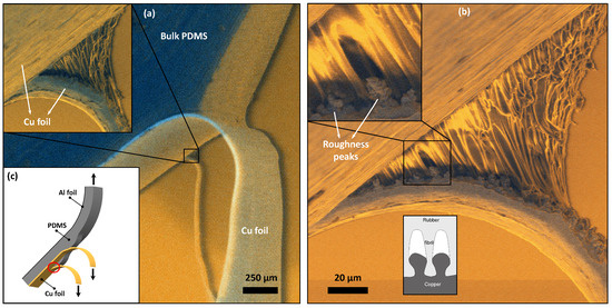 Figure 2b illustrates the occurring PDMS fibrillation during delamination, as visualized from the delamination front side of the sample. From a large number of ESEM images, it was observed that the fibrils initiate by delamination at the roughness peaks and remain attached to the valleys up to the moment of failure [28]. Initiated fibrils are elongated until they rupture or debond at the copper surface. Note that this mechanism is similar to that observed for the Thermoplastic Urethane-copper interface, as discussed in [27], where the same copper foil is applied. The initiation of fibrillation will be studied in more detail in Section 4.3 by means of an alternative peel test.
