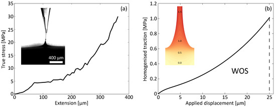 First, the contribution of fibril mechanics to the WOS is quantified by means of a micromechanical model of a single fibril, in which the growth of a nucleated fibril up to the moment of fracture is described. Given the large variation in measured stress-strain curves for rubber materials reported in the literature [55], a small scale single fibril experiment is performed to characterize the material properties. In the experiment, hollow tips are fabricated from glass tubes (outer diameter 1 mm, inner diameter 0.58 mm). The tip is attached to an aluminium cantilever having a stiffness of 13 N/m. After mixing and degassing, the PDMS is poured into an aluminium container. The container is moved towards the tip in order to form a capillary bridge by means of a micro-precision stage. The PDMS is cured for 1 hour at 100 by a heating stage. After cooling down to room temperature, the load is applied at a rate of 30 m/s. The experiment is visualized by a Zeiss V20 optical microscope (Oberkochen, Germany) coupled to a Zeis Axiocam HR camera, which records three frames per second. The tip is tracked using GDIC [56], which is optimized to deal with sparse patterns and rigid body displacements. The resulting fibril force is accurately measured from the movement of the tip by using the known (low) cantilever stiffness. The maximum true stress in the fibril is calculated in the smallest cross-section, which is obtained from tracking the contour of the fibril using a gray value thresholding method. The resulting fibril fracture stress values are extracted from three successful experiments, and range between 25 and 30 MPa, showing a relatively low variability [55]. An example of a resulting stress–extension curve is shown in Figure 5a in which the inset shows the single fibril experiment just before fibril rupture. Note that the parameter identification procedure was performed on the PDMS fibril outside the glass tip, thereby preventing any influence of the glass–PDMS interaction.