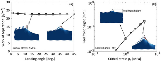 Next, the effect of the critical stress is studied. For this purpose, the critical stress value is varied between MPa and MPa. These values are motivated by the calculated homogenised single fibril strength (Figure 5b) and assuming a surface area fraction of 50% between fibrils and crack surface. Examples of the resulting deformed geometries are shown in the insets of Figure 6b, at a loading angle of 45. Comparison of the calculated peel front geometries with the experimentally observed lift-off geometry (e.g., Figure 1) confirm the pertinence of the applied loading conditions. The calculated peel front height (defined in the left inset), and hence the size of the fracture process zone, as function of the critical stress is shown in Figure 6b, and suggests a correlation between the WOS value and the peel front height.