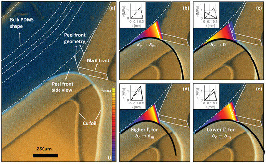 The values of the CZ parameters are obtained by minimizing the difference between the shape of the deformed PDMS and the curved copper foil at the delamination front as determined from the simulations and the experiments, similar to [25,26]. Examples of the comparison of several TSLs with the experiment are given in Figure 7b–e, in which the thick black line indicates the copper foil and the CZ elements are coloured by their traction value. For each TSL, de traction-separation curve is given in the insets. The parameter set that best describes the delamination front consists of J, MPa, mm and mm, of which the result is shown in Figure 7b. Notice that the thus identified value is similar to the homogenised single fibril value of 1.0 MPa (see Figure 5b).