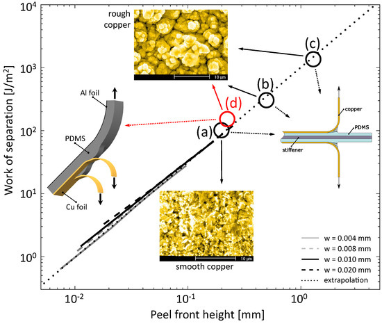 As additional validation, these newly obtained values for and peel front height are included in the WOS-peel front height curve as a red circle (see Figure 8). The samples are significantly different in geometry and loading condition, which is reflected by an order of magnitude difference in the peel front height for the three peel tests performed on the same rough copper specimen (data points (b), (c), and (d) in the figure). Nevertheless, the new data point shows an adequate agreement with the earlier established relation between the WOS and the peel front height. This proves that the relevant mechanisms are equal for the different samples and, therefore, it is concluded that the key parameter that controls the WOS is the peel front height. The actual sample design parameters such as PDMS thickness and backside layer(s) are only of secondary influence through the peel front height.