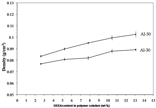Density as a function of amine content for a 5 wt. % polymer material.