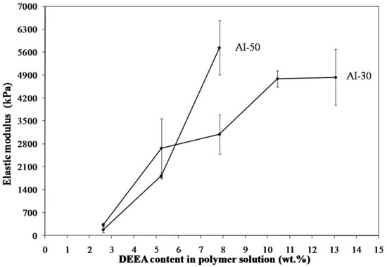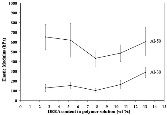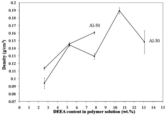 Materials containing only polymer, i.e., no clay, were created from the 5 wt. % solutions of AI-30 and AI-50 in order to investigate the effect of clay on the properties. Increasing the amine concentration proved detrimental to the AI-50 composites above six equivalents of amine. The plasticizing effect of such a large excess of amine could contribute to the foam-like structure which is seen in the higher amine concentrations (Figure 6). The foam-like structures were very brittle and unable to be mechanically tested or measured for density due to the non-uniform shape. AI-30 materials did not show the same level of bubble formation and therefore useful materials can be created up to at least 10 equivalents of amine. The internal structure of the polymer-only materials is much smoother and more uniform than that seen when clay is included (Figure 7). When it was included the clay is the main component of the system, 66 wt. % in the final, dried material, and therefore the polymer acts primarily as a binder to the clay particles without the clay in the system, the polymer is free to form smooth layers and in the case of AI-30 these layers are highly flexible due to their dimensions. The density of these polymer-only materials increases with amine content, again due to the plasticized polymer being able to shrink more easily (Figure 8); densities of these aerogels show greater variability than those of typical freeze-dried materials [15] because of the complex interactions of plasticization and crosslinking, effects not studied in detail to date in such systems. With variability in densities comes some variability in modulus, as this mechanical property is highly sensitive to polymer density. As the amine content was increased, the modulus and toughness also showed a general increasing trend (Figure 9 and Figure 10). AI-30 and AI-50 exhibited drastic increases as the amine content increases, gaining over 10 times the stiffness.