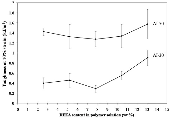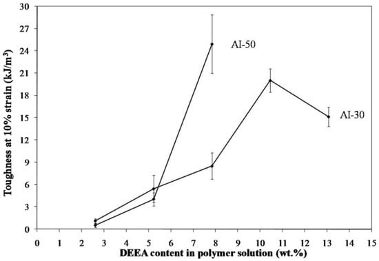 Freeze drying of aqueous solutions of the poly(amic acid) form of the poly(amide-imides) (PAIs) in the presence of diethylaminoethanol (which increases the polymer solubility in water) readily produced mechanically-fragile monoliths, which when thermally treated for several hours at 200 °C under vacuum, produced robust structures with densities in the range of 0.07–0.19 g/cm3. The concentration of amine in the preparation solution was found to have little effect on the visual appearance of the PAI clay composites. The composites all exhibited lamellar structures (Figure 2) independent of amine concentration. The structures of freeze dried aerogels have been previously reported, and range from cellular to lamellar solids, depending primarily upon the solute concentrations and freezing temperatures employed [6,14]. Increasing the concentration of amine increased the density of the composites slightly from about 0.085 g/cm3 and 0.075 g/cm3 to just over 0.1 g/cm3 and 0.08 g/cm3 for the AI-50 and AI-30 composites respectively (Figure 3). The moduli of AI-50 composites were generally higher than that of AI-30 for all amine concentrations, most likely due to the more rigid m-phenylene diamine monomer incorporated into the AI-50 backbone. Within experimental error, the compressive moduli did not change with increasing amine concentration for the AI-50 composite materials (Figure 4). The AI-30 aerogel composites showed a slight increase in modulus at the highest amine concentration; our prior work has shown that mechanical properties increase geometrically with aerogel density, so these increases most likely reflect the modest density increases observed. Toughness, the amount of energy absorbed by a material for a given strain value, were generally independent of the solution amine concentrations (Figure 5). It can generally be concluded then that the amine processing aid used to achieve relatively high poly(amide-imide) solution concentrations had little effect on the final aerogel products.
