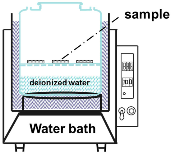 The accelerated modified testing involved deposition of a solid NaCl layer on the surface of 2A02 Al alloy samples (not NaCl spray). The deposited NaCl layer was applied to preheat the sample surfaces by repeatedly brushing with a saturated solution of NaCl in water. The surface density of the deposited NaCl was approximately 4 ± 0.2 mg/cm2 [47,48]. The experimental simulation device, as illustrated in Figure 1, is divided into three parts: a water bath, a glass test container, and a perforated intermediate bulkhead. Temperature control (±0.5 °C) is achieved using the water bath, whereas the temperature in the test glass container is further calibrated by a thermometer. In order to mimic the service temperature of the aircraft engine fan blade, the selected exposure temperatures were 30, 40, 50, 60, 70, and 80 °C.