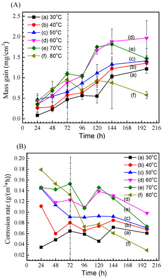 Figure 3A shows the mass gain as a function of exposure time for the corrosion of 2A02 Al alloy exposed under solid NaCl deposit in 98 ± 2% relative humidity at different temperatures. It is found that mass gain continuously increased, with no pronounced restraint in the later stages at 30, 40, 50, and 60 °C. However, for 70 and 80 °C, the mass gain increases with time at the initial stage before 72 h, but exhibits a significant drop after 144 h for 70 °C and 120 h for 80 °C. Furthermore, by comparing the mass gain at different temperatures under the same exposure time, it can be seen that higher temperature can accelerate corrosion rates at the initial stages of corrosion, especially before 72 h. With prolonged exposure, this trend was only sustained at temperatures ≤60 °C, whereas the mass gain at 70 and 80 °C decreased after 72 h. Interestingly, after 200 h, the maximum mass gain was observed at 60 °C. Therefore, the corrosion behavior of this Al alloy under the test conditions manifests two distinguishing time intervals: the early stages of corrosion (1–72 h) and the later stages of corrosion (72–200 h), both of which are indicated by the dash-dot line in Figure 3A. The early stage of all the curves at different temperatures shows a trend of sustained increase in the corrosion rate; however, in the later stage, the curves present a descending trend for 70 and 80 °C.