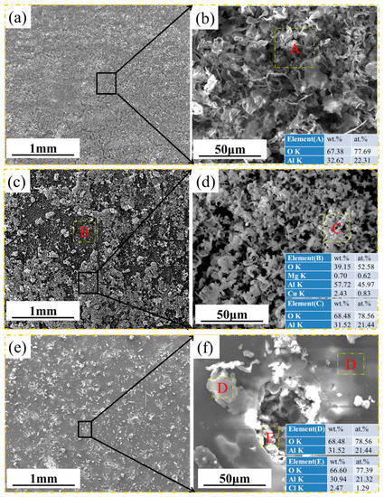 Figure 4 shows SEM images of the surface morphology of the samples at 30, 60, and 80 °C after corrosion for 72 h. Figure 4a shows that the corrosion products formed at 30 °C covered the entire surface of the sample, which have a clear and wood-shaving shape, as shown in Figure 4b. The EDS results show the corrosion product in region A to be rich in the elements O and Al. Figure 4c shows that the corrosion products formed at 60 °C contain a dark compact inner layer and a loose white outer layer. This white loose outer layer also has shaving-shaped particles, though significantly smaller and more fine-grained than those formed at 30 °C. The EDS results show that there are Al oxides in the outer layer, whereas the inner layer comprised a mixture of Al, Cu, Mg, and O. The morphology of the corrosion products at 80 °C, as shown in Figure 4e, is characterized by a compact layer with tiny particles scattered on its surface. However, the larger magnification image in Figure 4f gives information that the dense layer contains a lot of corrosion defects with high Cl content.