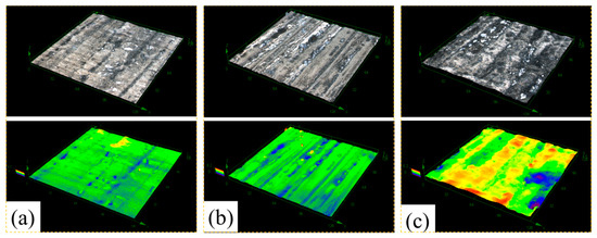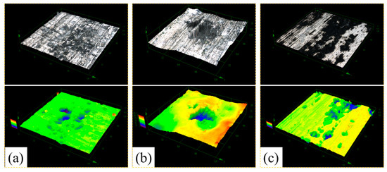 LSCM morphologies of 2A02 Al alloy substrate on removal of corrosion products after corrosion for 200 h (a) at 30 °C; (b) at 60 °C; and (c) at 80 °C.
