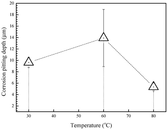 Measured results of corrosion pitting depths of 2A02 Al alloy substrate on removal of corrosion products after corrosion for 200 h at 30 °C, 60 °C and 80 °C. This result corresponds to Figure 8 and was obtained from measured results by LSCM using our own software OLS4000.