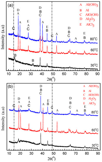 Figure 10b shows the XRD patterns of the corrosion products formed on the surface of 2A02 Al alloy after 200 h of corrosion. The corrosion products Al(OH)3, AlCl3, and Al2O3 can be detected on all samples corroded at different temperatures, whereas AlO(OH) was again only detected on samples corroded at 80 °C.