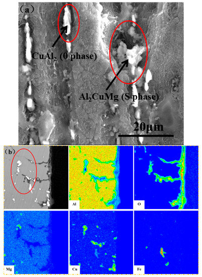 Longitudinal (L-section), long transverse (T-section), and short transverse (S-section) are the terms conventionally used to label the three directions along the microstructure of 2A02 Al alloy. Figure 2a shows the typical microstructure of 2A02 Al alloy viewed with SEM (in backscattered electron mode), and the three-dimensional stereogram indicates the existence and distribution of constituent particles. The L-Section direction corresponds to the Al plate rolling direction, and the S-Section was the experimental side in this work. Figure 2b shows the S-Section microstructure of 2A02 Al alloy. The additional EDS results of the second phases evidenced: (i) the presence of Al, Mg and Cu elements in most of the particles; (ii) the presence of Al and Cu in the other small pellets and (iii) the presence of Al, Fe, Cu, Mn, and Si elements in some narrow strip particles. The composition of the second phases in 2XXX series Al alloys has been investigated by many researchers [49,50]. The S phase, which consists of Al, Mg, and Cu, is commonly Al2CuMg in 2XXX series Al alloys. The θ (CuAl2) phase consists of Al and Cu, and the AlFeCuMnSi phase consists of Al, Fe, Cu, Mn, and Si. In general, the second phases observed include: the Al-Cu-Mg phase identified as Al2CuMg (S phase), the Al-Cu phase identified as CuAl2 (θ phase), and the AlFeCuMnSi phase, as illustrated in Figure 1.