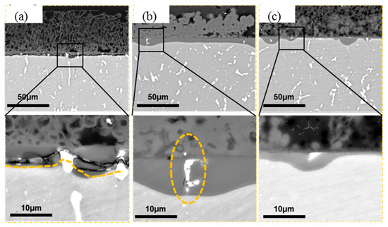 Figure 14 shows the cross-sectional morphology of the corrosion product layers formed on 2A02 Al alloy after 200 h of corrosion at several temperatures. It shows that corrosion products have two layers: a loose outer layer and a compact inner layer at all three temperatures. It is interesting that the interface between both layers looks like the original base metal surface. The second phase remained in the compact inner layer of corrosion products, which seemed no longer involved in the corrosion process. The enlarged morphology images of the inner oxide layers formed at the three temperatures showed obvious cracks appearing in the inner layer at 30 °C, and a small number of cracks were found in the inner layer of the corrosion products formed at 60 °C. However, the cracks are almost unseen in the inner layer of the corrosion products formed at 80 °C. This possibly suggests that the inner layer of the corrosion products became more and more compact with increasing temperature.