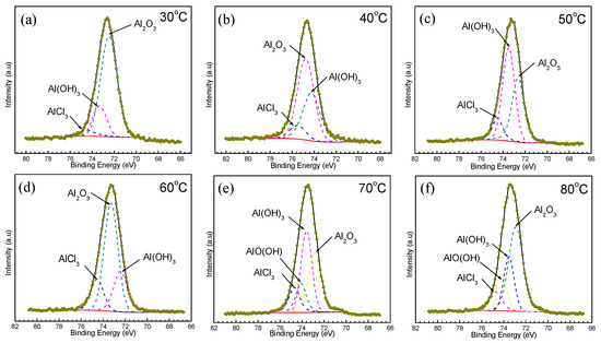 Figure 17 shows the XPS results of the powder corrosion product of 2A02 Al alloy formed after 200 h of corrosion in the simulated marine atmospheric environment at different temperatures. The corrosion scales were scraped off from the corroded samples of 2A02 Al alloy. The powder samples could subsequently be comprehensively characterized to provide information about the composition of the corrosion layer. Through the XPS-peak-differentiation of Al at different temperatures, we detected the presence of Al2O3, Al(OH)3, and AlCl3 formed at all the temperatures, but AlO(OH) only appeared at 70 and 80 °C. This result is consistent with the XRD analysis. In XPS analysis, all the possible compounds containing Al were deduced from the XPS-peak-differentiation, and the peak area of the possible compound represents its relative content in the corrosion products. However, it should be noted that the relative content of different compounds containing the same element can only be compared in the same sample. In order to give a clearer description about the content of the corrosion products, the intensity curves in the XPS results were processed to be displayed numerically. The compound atomic percentage, which is represented by the XPS-peak-differentiation area percentage, was used to express the content of the corrosion products. The ratio of the AlCl3 peak area to that of the total Al is regarded as the content percentage of AlCl3 in the sample, as shown in Figure 17. The content percentages for other compounds containing Al were similarly obtained. The calculated contents of each compound produced at different temperatures are shown in Table 1.