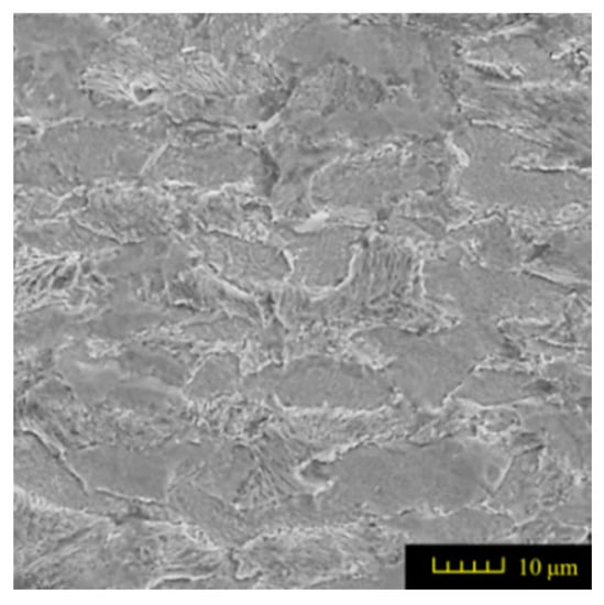 Commercially available AISI 1045 steel (HRC 34, Taiyuan Iron and Steel (GROUP) Co., Ltd., Taiyuan, China) was machined to six workpieces with the dimensions of 100 mm × 10 mm × 20 mm. The grinding process induced 25 mm deep grooves in each specimen. Each groove was formed in one grinding travel. The chemical composition of AISI 1045 steel is given in Table 1. The initial metallographic microstructures of the workpiece material before machining was observed by scanning electron microscope (SEM) and the results are shown in Figure 1.